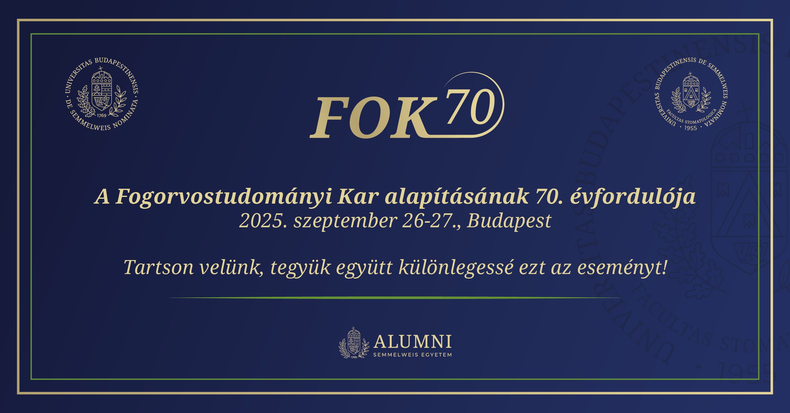 2025. szeptember 26-27-én ünnepeljünk Semmelweis Egyetem Fogorvostudományi Kar megalakulásának 70. születésnapját, mely alkalomból színes programokkal várják a kollégákat a szervezők.